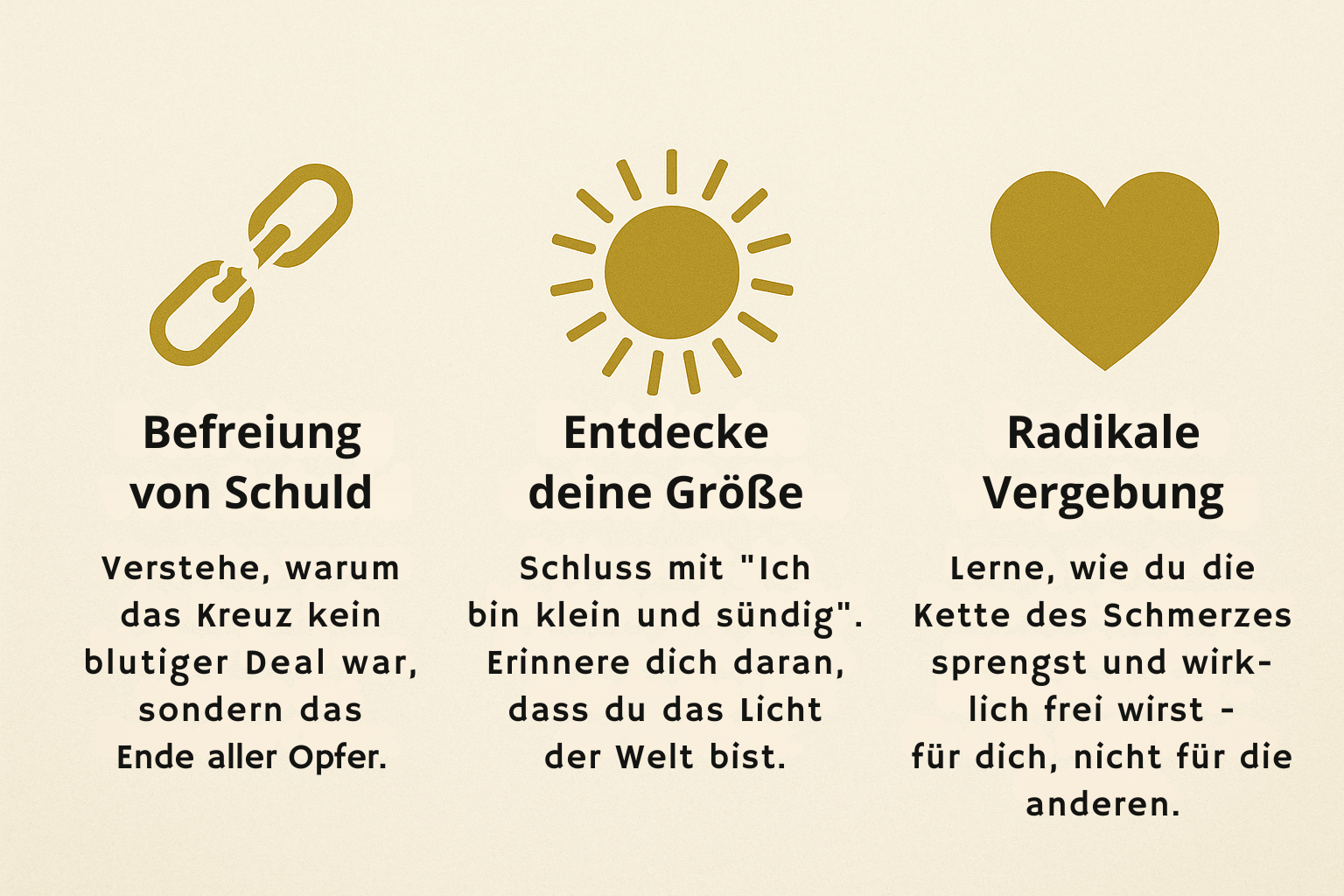 • TEIL 1: Die Befreiung: Wir räumen auf. Wir entmachten den „strafenden Vater“ (Kapitel 1) , entlarven die Sünde als bloßen Irrtum (Kapitel 2) und verstehen das Kreuz völlig neu (Kapitel 3). Du wirst spüren, wie die Last von deinen Schultern fällt.